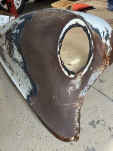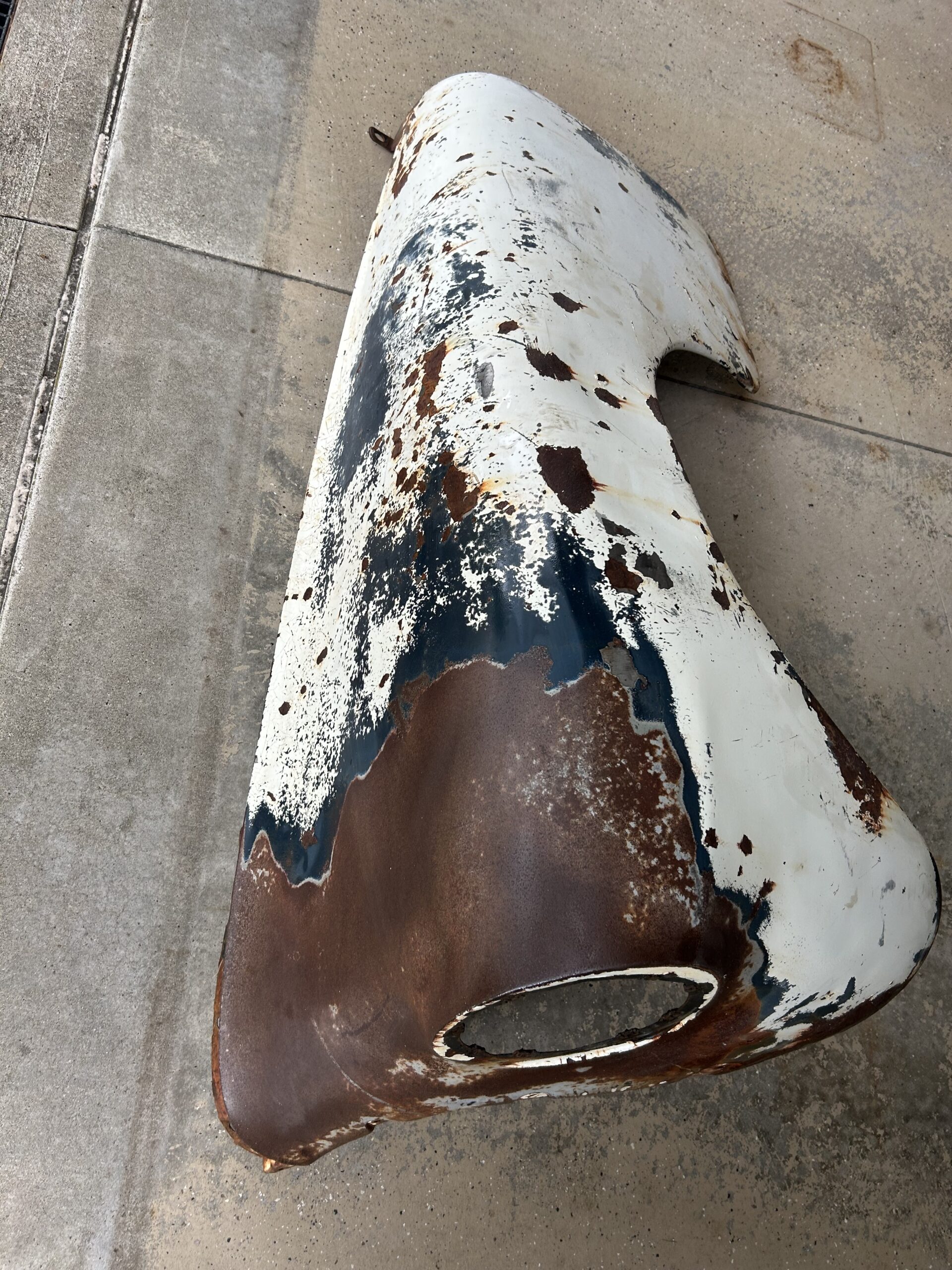 1947-1948 Chevrolet passenger car front fender. It has a couple of large dents. I see no rust thru on the outside. The inner reinforcment by the door has some rust. If interested, email me for more pictures. $15 if picked up at my house. $25 if picked up at the Hershey Swap Meet in October 2025 or you pay for all shipping costs if you want it shipped.