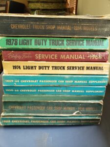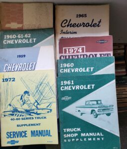 This is a factory set, about 120 total original manuals from the 1950’s to early 1980’s. Includes service bulletins, accessories, Fisher Body, wiring diagrams and shop service manuals. Car and Truck models. Came from a dealership in Eastern Washington and has been stored in a dry and heated location. Starts around 1955. This would look great in a Chevy collectors shop. Pick up in beautiful Winlock, Washington or shipped at buyers cost.
