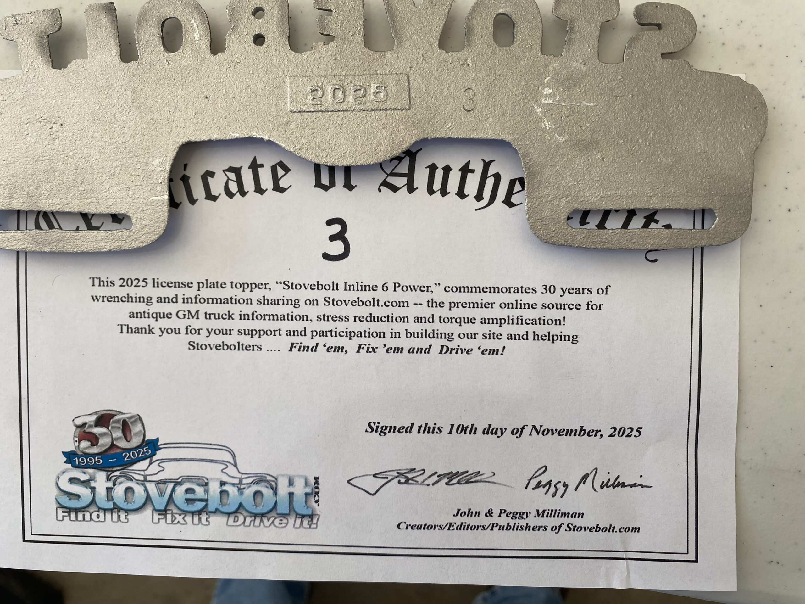 This freshly casted limited edition aluminum topper can be yours for $75 shipped via USPS priority mai. They are hand finished and polished, and are individually numbered via stamping on the backside. They come with a certificate of authenticity from the Stovebolt.com office.