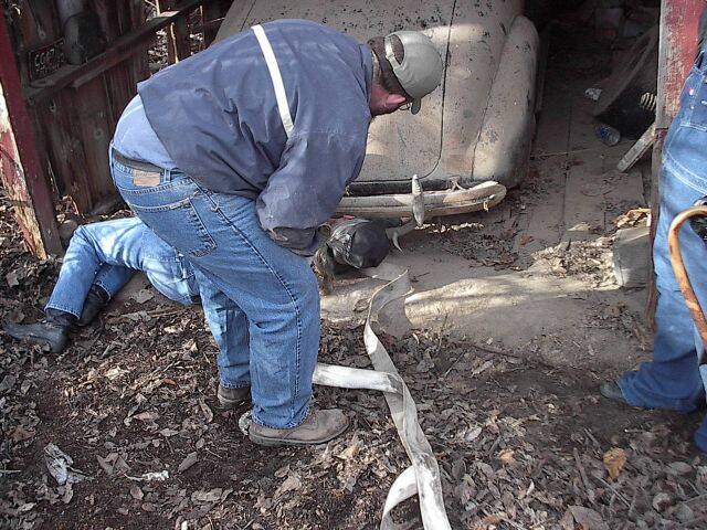 Well, the family I bought this old car from are "Snowbirds" and are preparing to move away from Tennessee's frigid weather, so I had to get the car out of their garage or leave it until they come back in the spring. In all honesty, they are really nice people and they have accommodated my intrusions to get the car at least to a rolling status. Instead of trying to free the break drum and prevent simply dragging the car with a locked wheel onto my beautiful trailer, I used one of my wheel dollies and pulled it up on my trailer without a single bad word. So, the 41 Coupe is seeing direct daylight for the first time in more than 10 years.