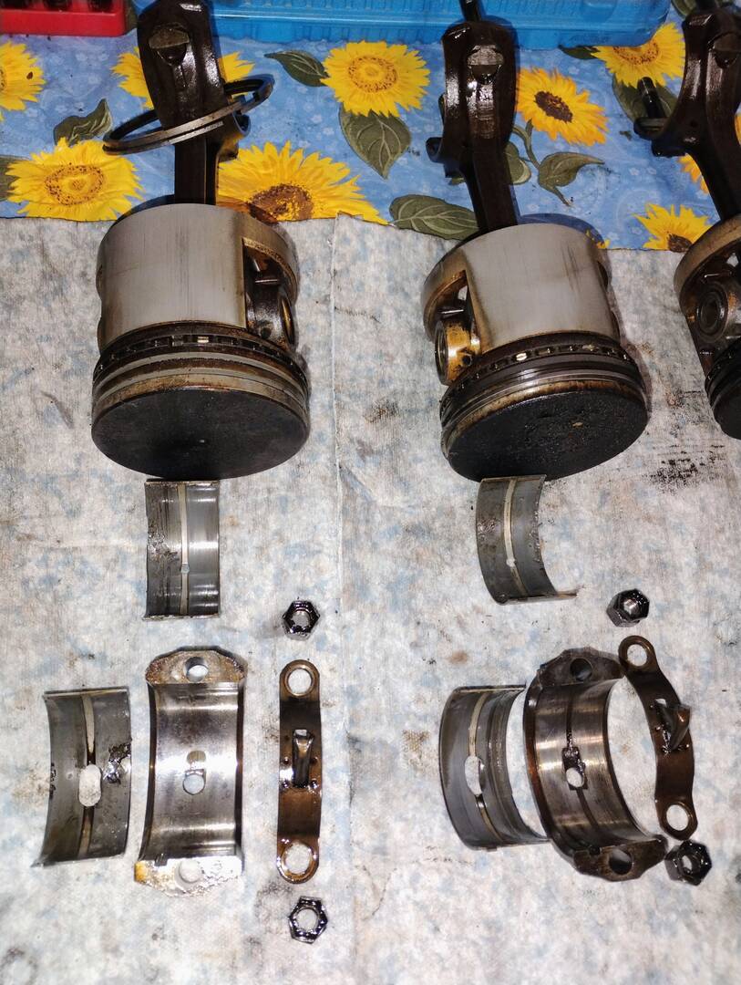 Aluminum pistons, rods bored for shells in place of the original babbitt, and crank journals ground undersize.