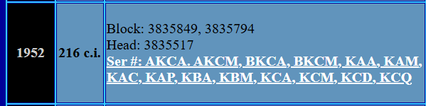 Block is 3835849 so this is not the original engine. That block is a 52 block. Head is 839401 41 - 48 so possibly stock head on a later 52 block.