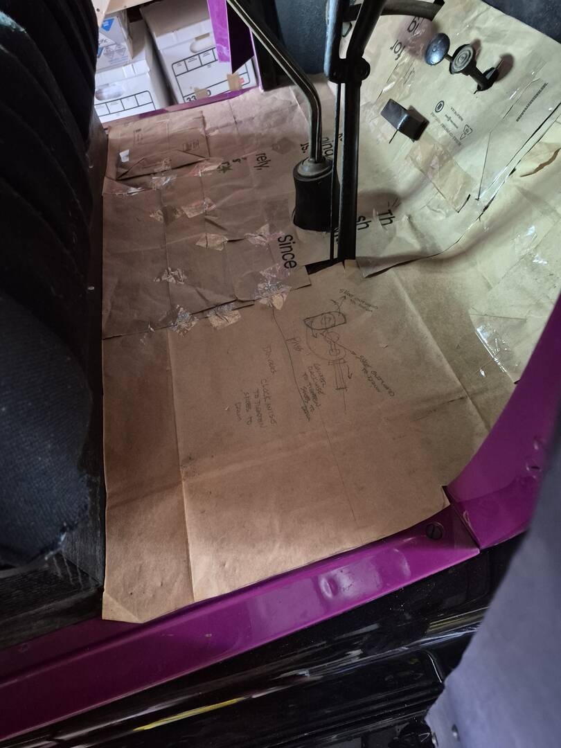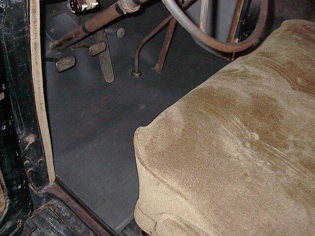 This is my first summer with my 29 Truck and its wood floor boards, the heat from the summer and the engine compartment was tremendous entering into the cab. Although there are no glass panels in the doors as of this year, and the windshield adjustment bracket assemblies are both missing (another winter project after the king pin replacements too) I temporarily closed the windshield. So, I purchased a 4ftx4ft rubber mat, with a spline facing on one side, and created a floor mat template using those brown shopping bags, and then transferred the pattern to the mat and cut out the pattern.